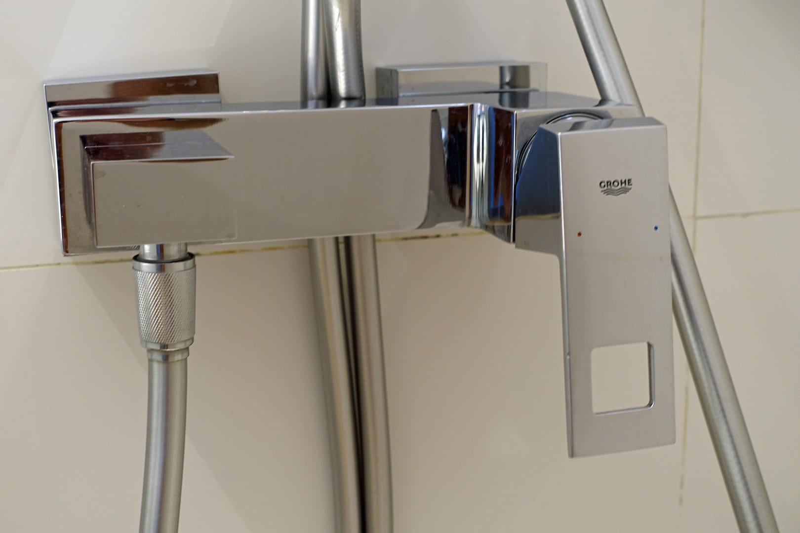 ZimmerSchick, aber scharfkantig: Designer-Armatur in der Duschkabine. Die Fliesenfugen könnten hin und wieder etwas Anti-Schimmel-Spray gebrauchen.