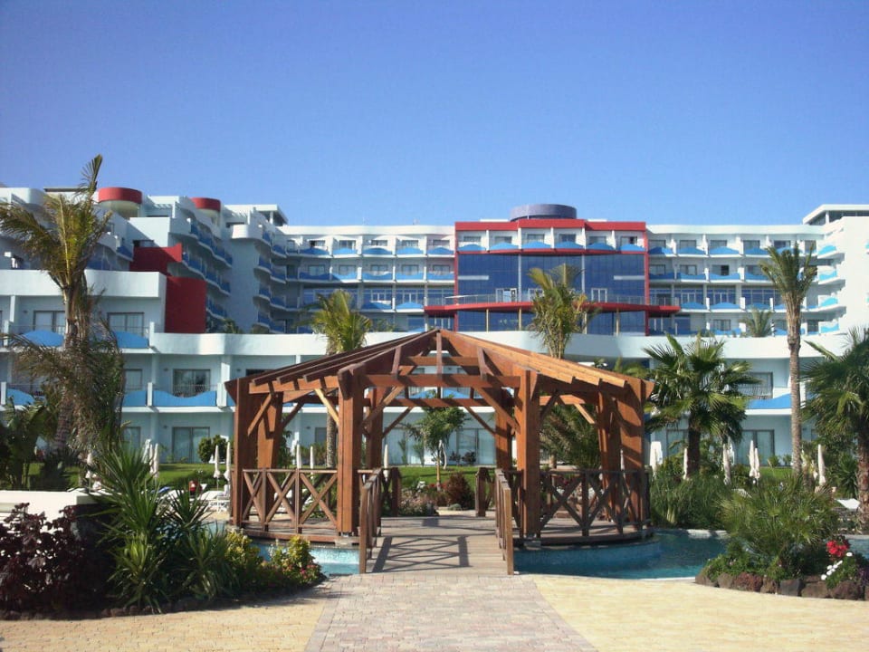 Blick von der unteren Poollandschaft auf das Hotel