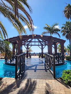 auf dem Weg zum Strand über die Poollandschaft