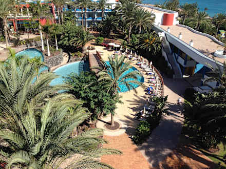 Blick auf den Garten und einen der Pools