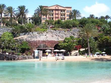 Das Bild vermittelt die Ansicht vom Meerwasserpool mit Strand auf das Hauptgebäude.