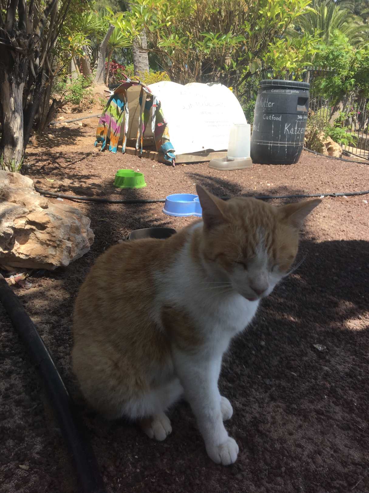 SonstigesFernando die Katze, die unbedingt viel gestreichelt werden möchte in der Katzenecke mit der Tonne für das Katzenfutter.