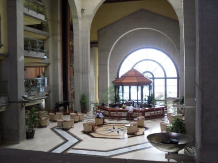 imposant, rechts die Rezeption, mittig die Lobby-Bar und direkter Blick auf die Poolanlage