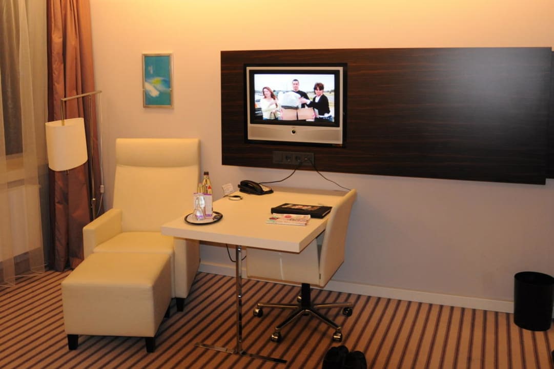 Blick vom Bett zum Schreibtisch, Liegesessel und Flat-TV