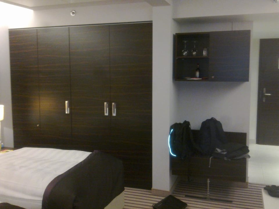 Schrank, Bett, Minibar - hinten die Eingangstür