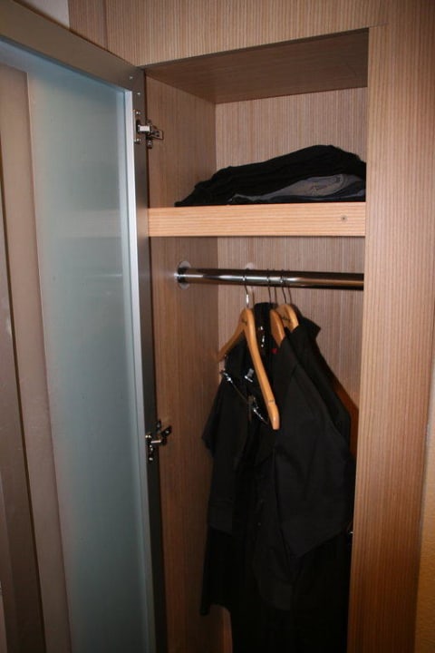 Das ist also der Schrank. Es passen max. 3 Kleiderbügel hinein, diese aber auch nur im 45°-Winkel. Die Ablagefläche darüber ist alles um Pullover o.ä. unterzubringen. Insgesamt ist Stauraum etwas knapp bemessen.
