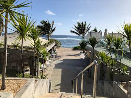Der Ausblick, wenn man ein paar Schritte aus der Lobby herausgeht... linksseitig ist das Restaurant Aqua 180 zu sehen, rechts ein Stück der Strandbar.