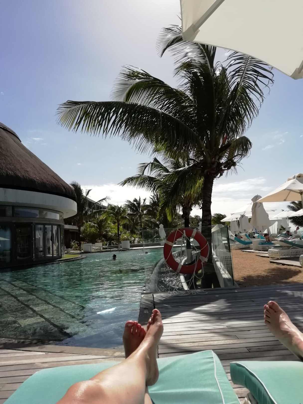 Pool Bereich mit ausreichender Liegen und Sonnenschirme.