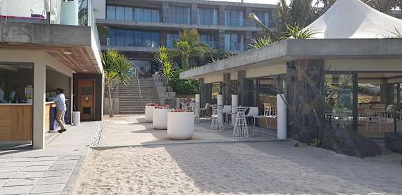 GastroDer Blick auf das Hotel von Strand aus, mit der Aqua Bar und der normalen Bar auf beiden Seiten.