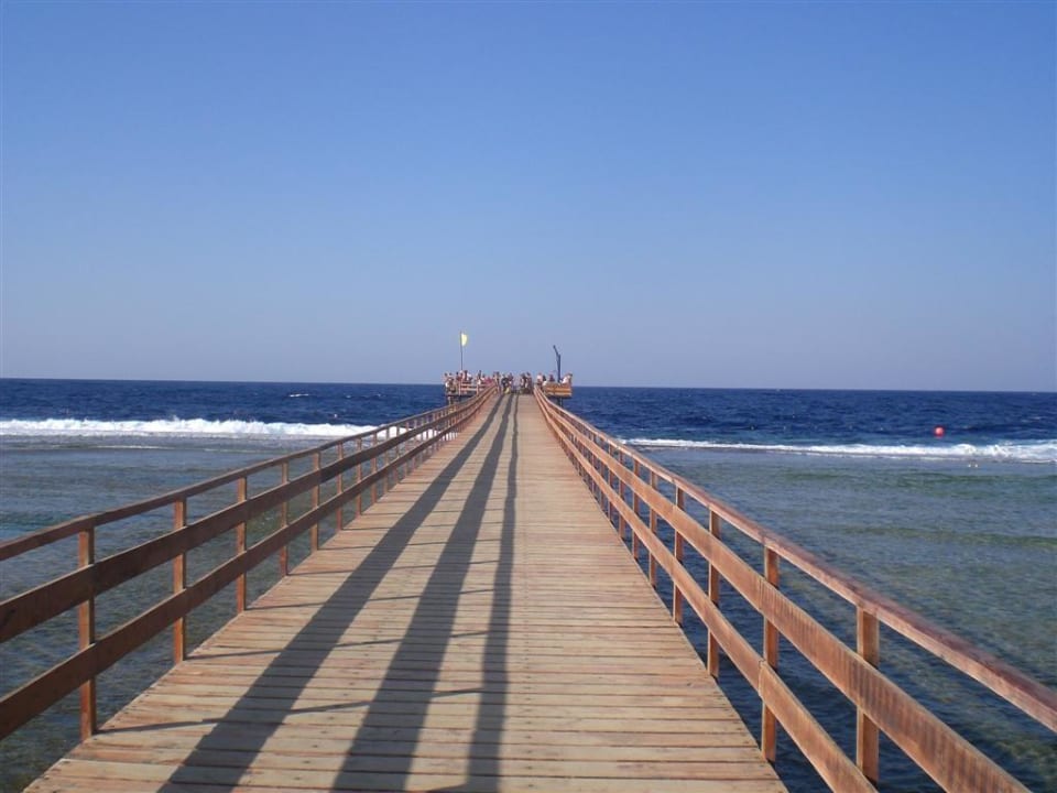 Blick auf den Steg, welcher das Schnorcheln am Hausriff bei ruhigem Wetter ermöglicht.