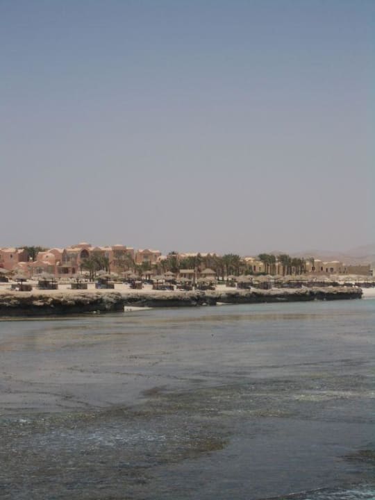 Blick vom Steg aus auf den Hotelstrand