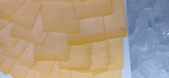GastroFrühstück 4 Sorten einheimische nasse Wurst. Käse 4 Sorten Schnittkäse nach oben gebogen ,zusammenklebend brauner Rand.