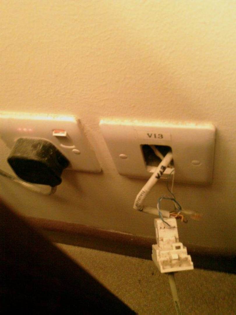 Die Steckdosen und Telefonanschlüsse hängen so in einem 5 Sterne Hotel aus der Mauer!