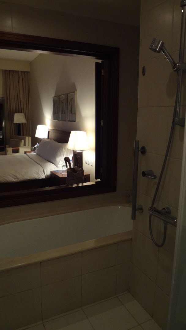 Dusche und Badewanne / Blick zum Bett