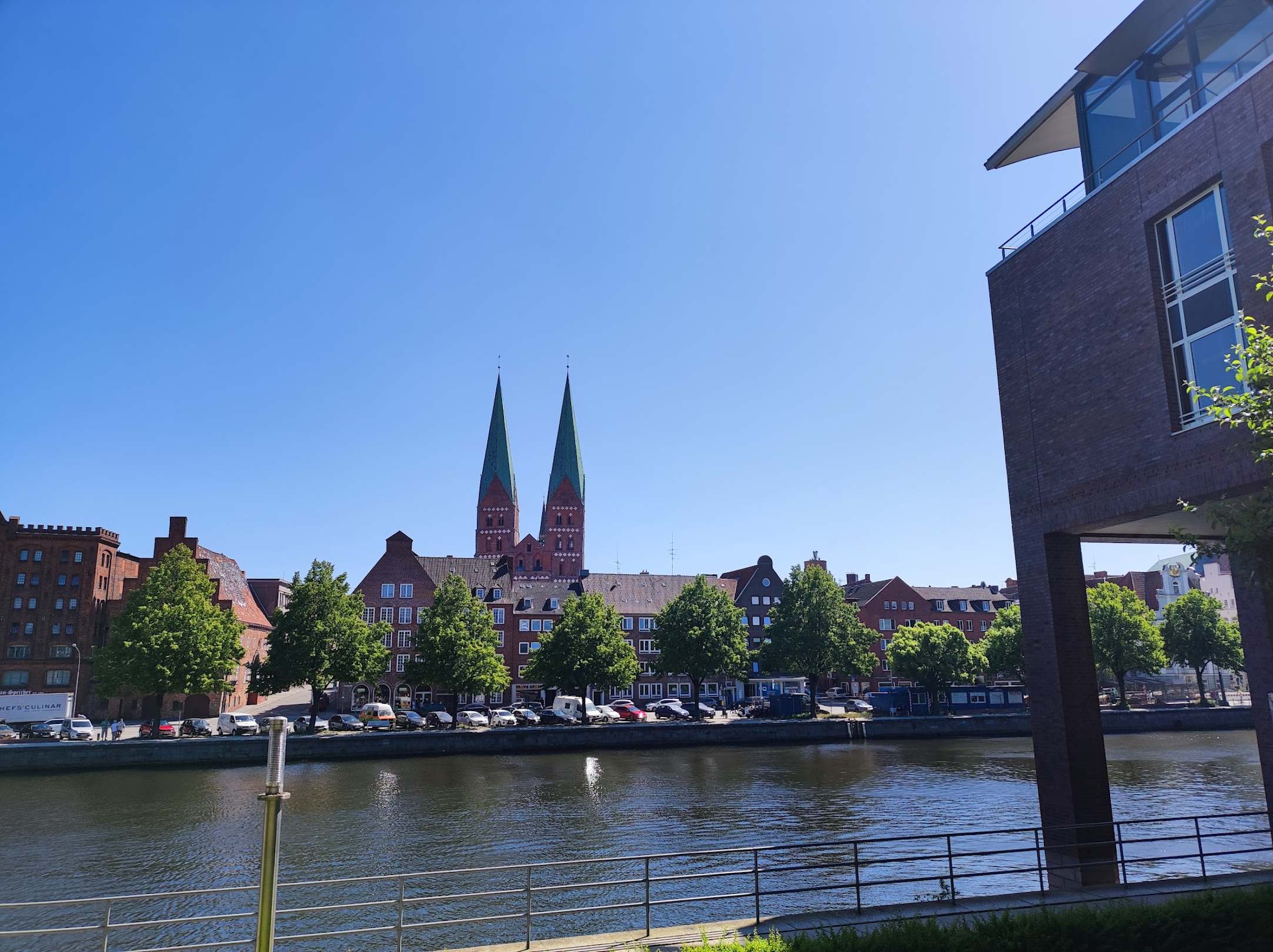 Biergarten mit Blick über die Trave auf die Marienkirche