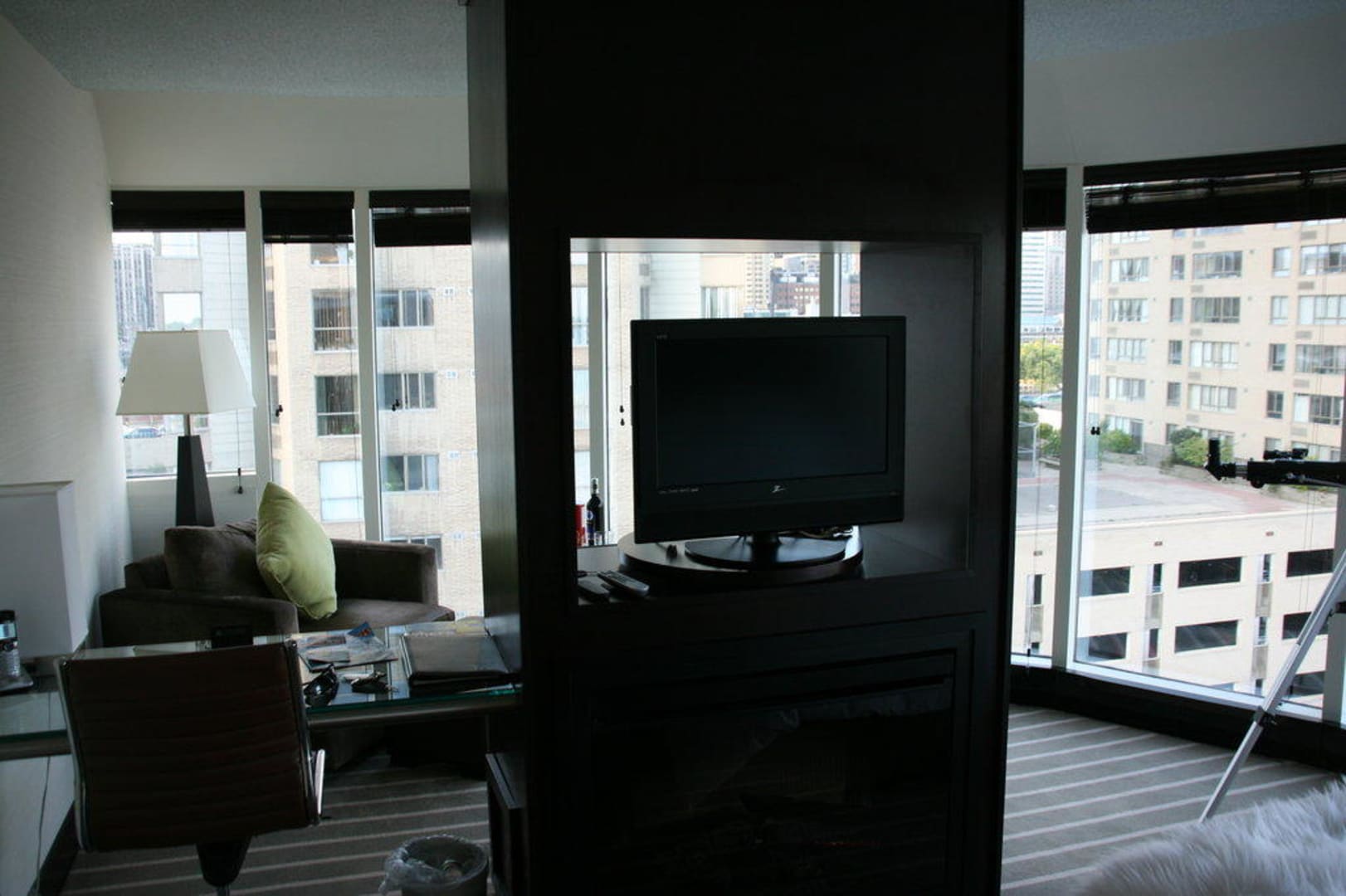 Hier sieht man den elektrischen Kamin mit TV und daneben den Schreibtisch. Hier war alles etwas kompakter, als im zweiten Studio.