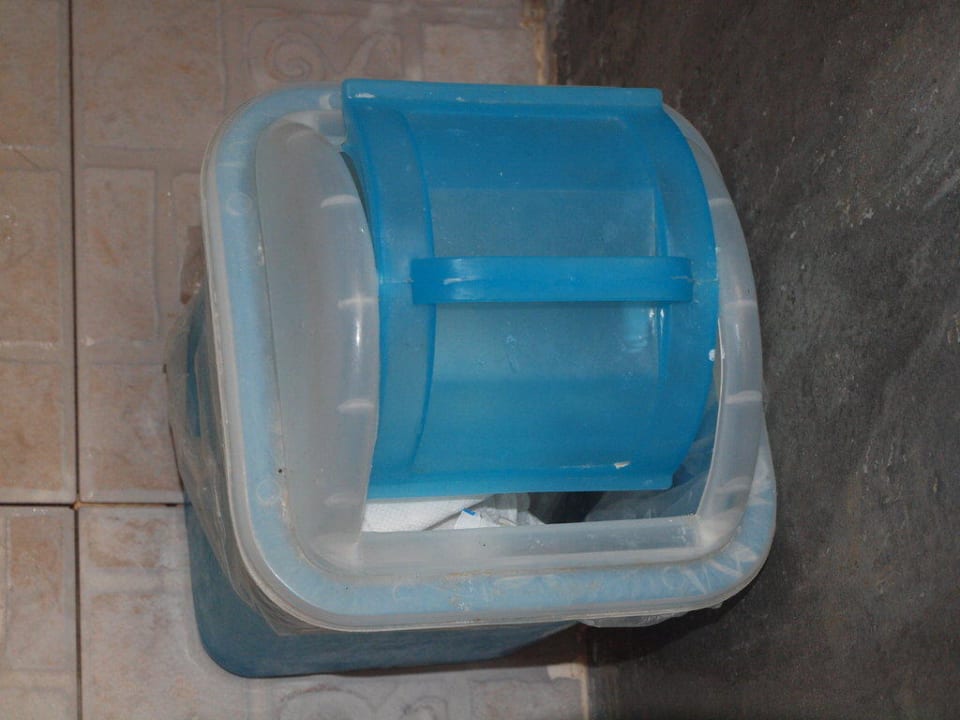 Da soll nun alles rein, was wir zuhause einfach wegspülen. Da freut man sich auf den Luxus zuhause, das Toilettenpapier einfach unter sich fallen lassen zu dürfen