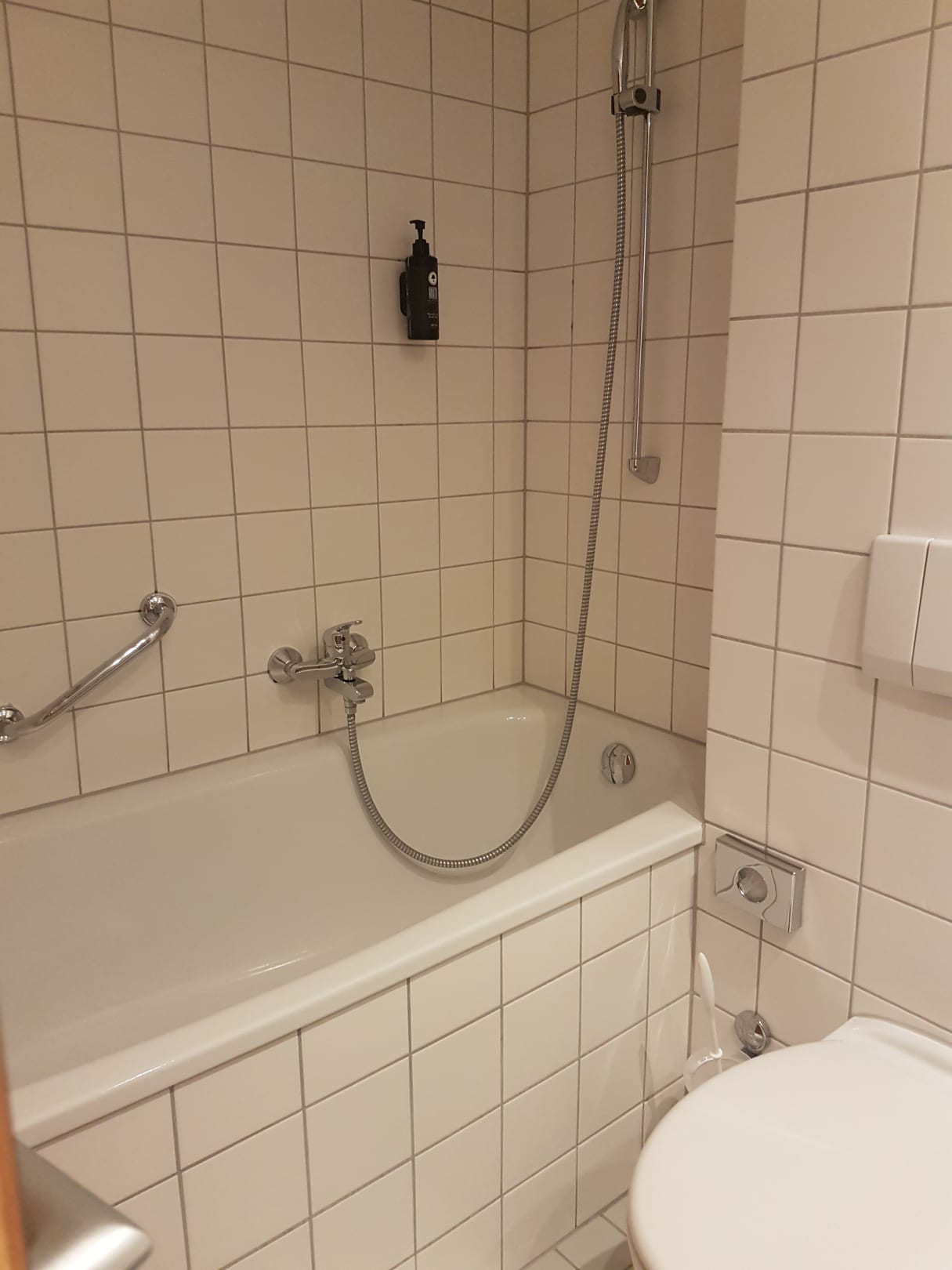 Bad Zimmer 220. Badewanne mit Duschvorhang.