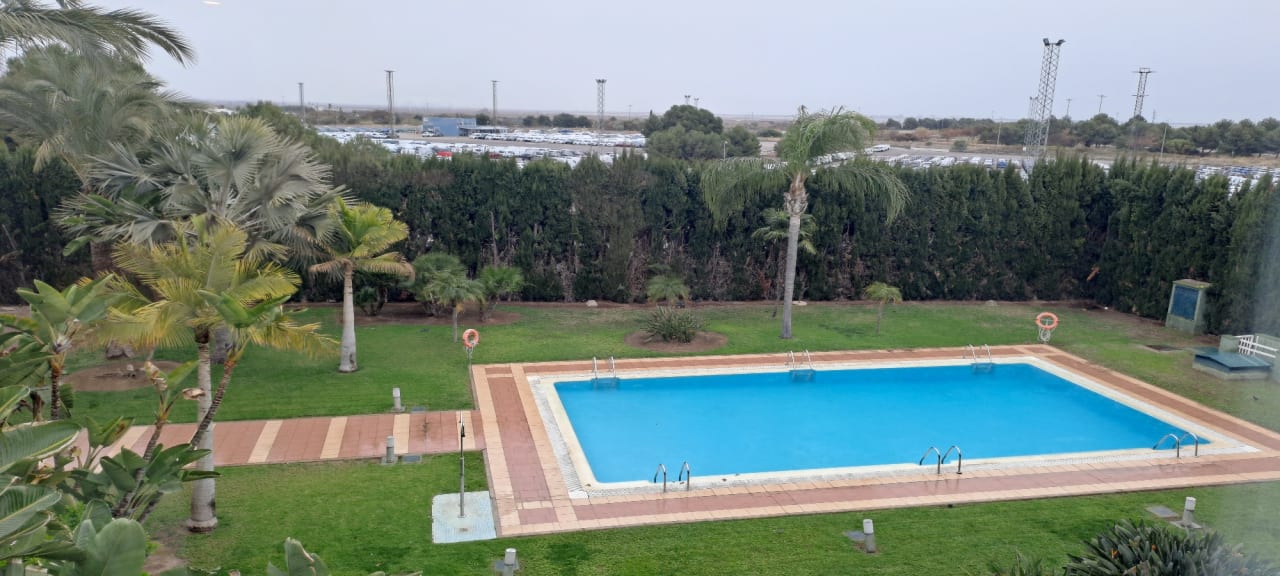 Gartenanlage mit Pool, im Hintergrund riesige Werksparkplätze