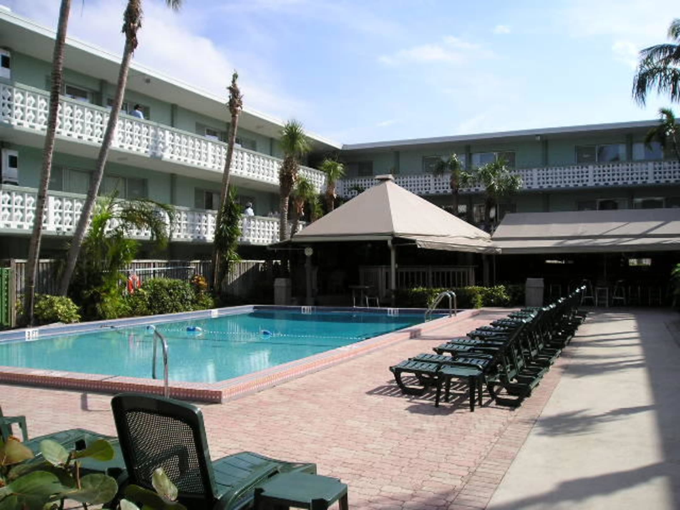 Pool Area and CorridorsDas Bild zeigt die Poollandschaft mit der Pool (Tiki-)Bar und die exterior corridors mit den Zugängen zu den Zimmern