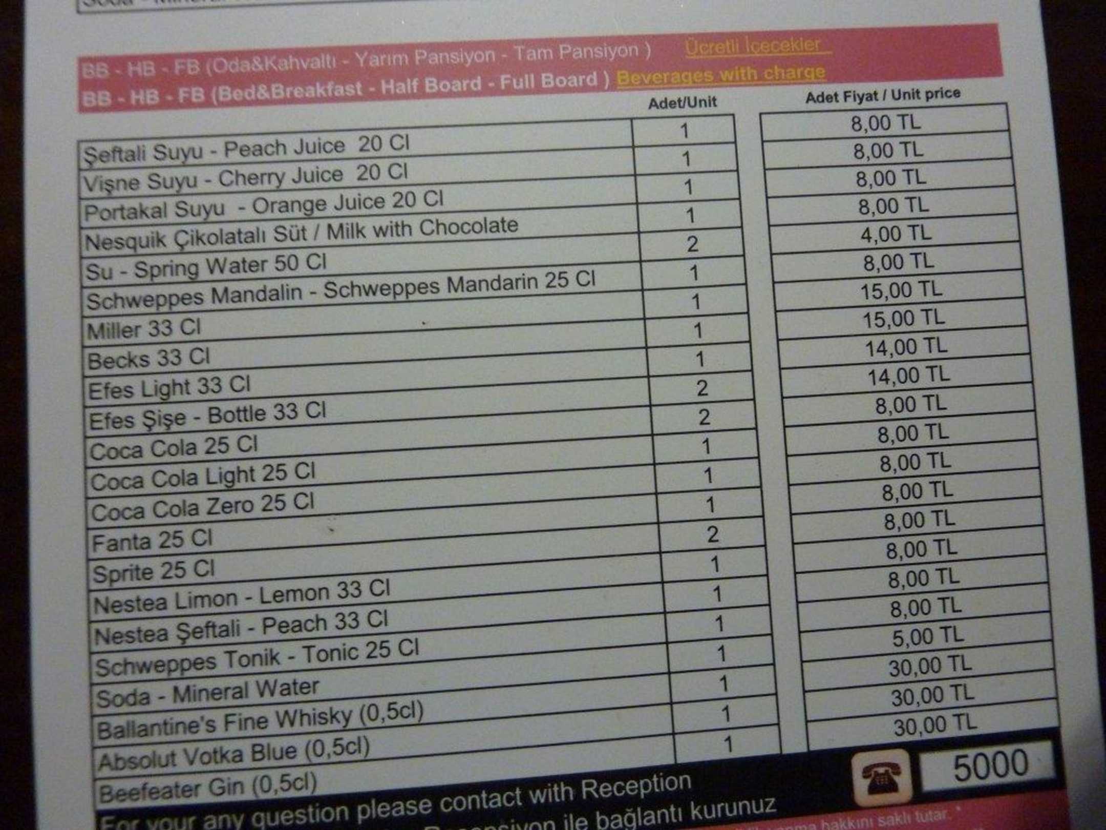 Zimmergetränkekarte Minibar