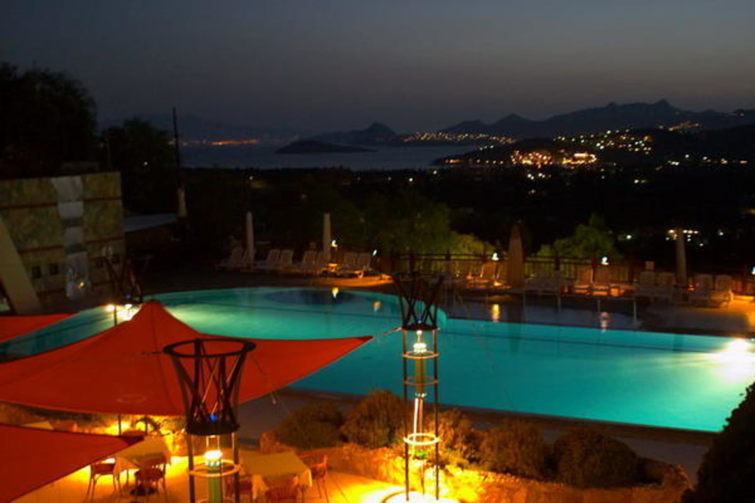 Blick von der Terasse auf den Pool bei Nacht