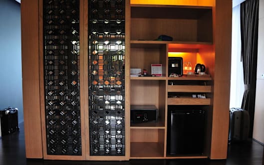Schrank mit Minibar und Safe