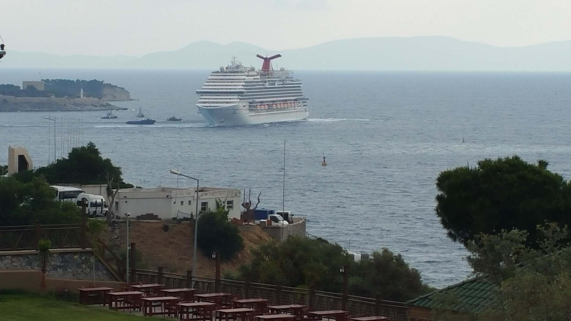 Kreuzfahrtschiff beim Ablegen im Hafen von Kusadasi