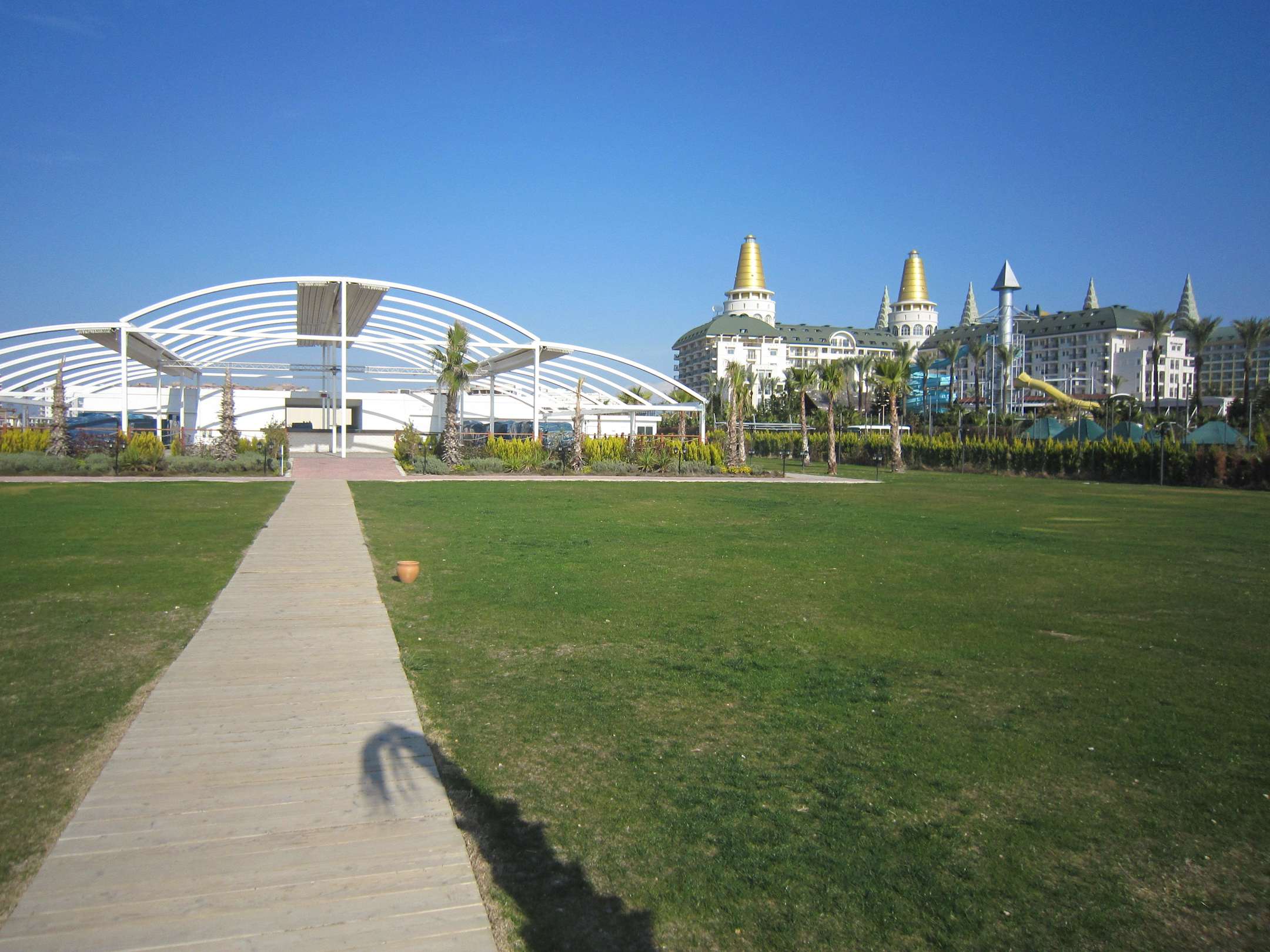 riesiges Restaurant am Strand für die Hotelgäste, Rasen, Tennis, etc.