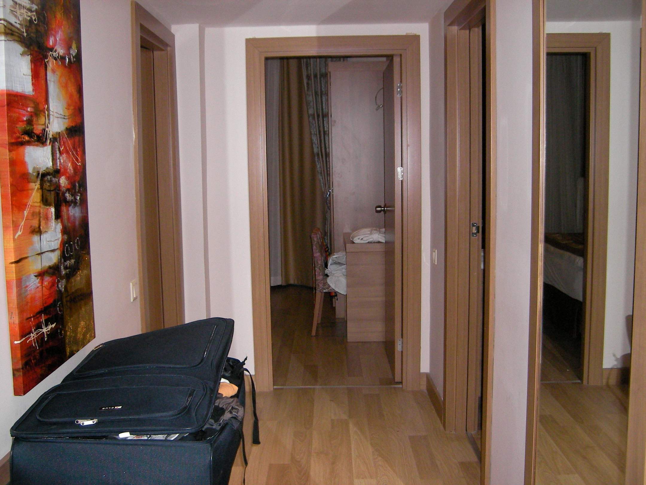 Familienzimmer: Flur mit KofferablageGeradeaus: Schlafzimmer mit Doppelbett, links gehts zum Badezimmer, rechts zum Wohnzimmer.