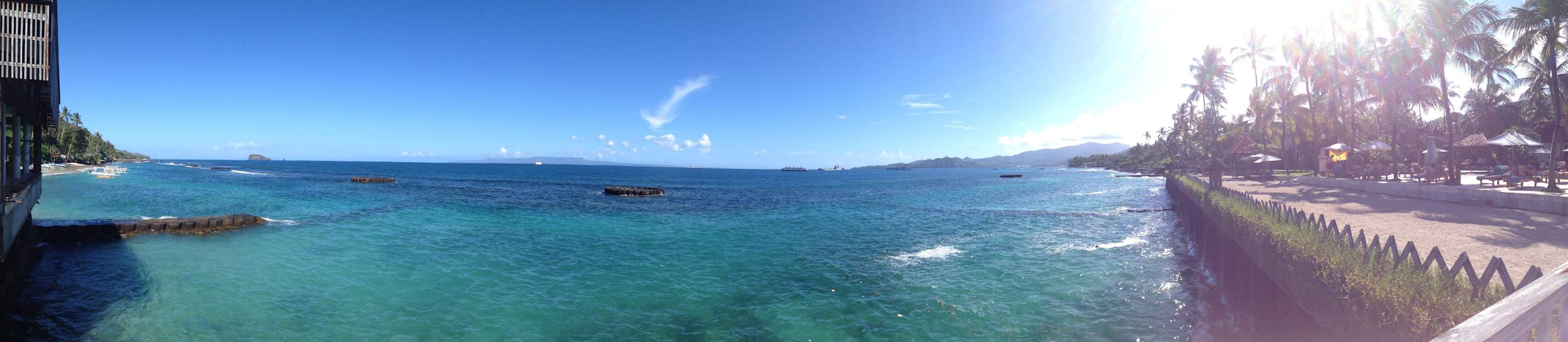 Blick vom Restaurant auf das Meer und Hotelanlage