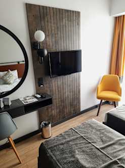 ZimmerStandard-Zimmer mit Sessel, Schreibtisch/Stuhl/Spiegel und TV-Gerät. Im TV leider nur eine sehr schlechte und verrauschte Bildqualität.