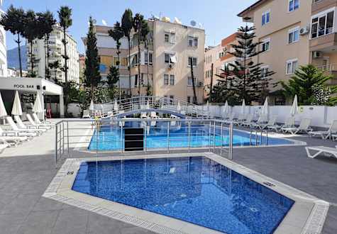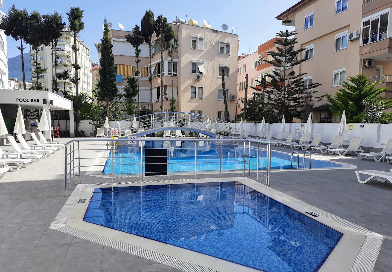 Pool-Gelände auf dem Hinterhof des Hotels. Jedoch von allen Seiten mit Gebäuden begrenzt.