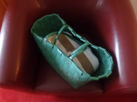 Im Kasten ist dieses Körbchen mit HandtüchernFür den Außen-Schwimmteich... mir war´s im Schnee ein bisserl zu kalt... ggg...