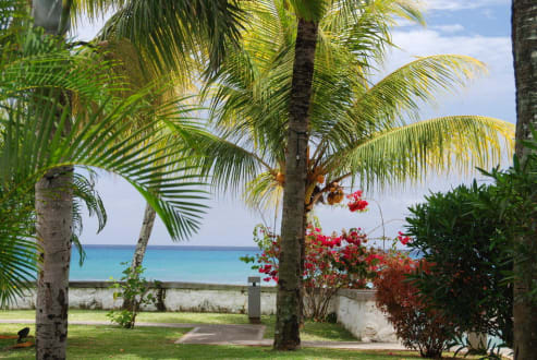 Blick durch den Garten aufs Meer