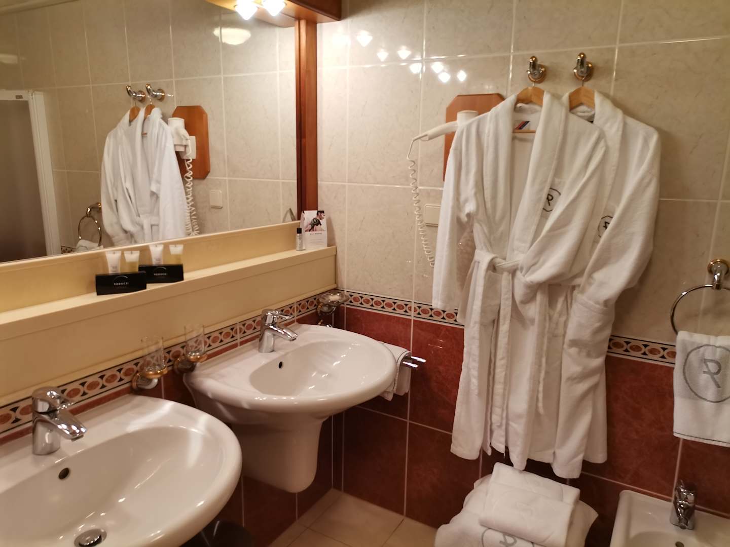 malerisch aufgehängte Bademäntel im Badezimmer.