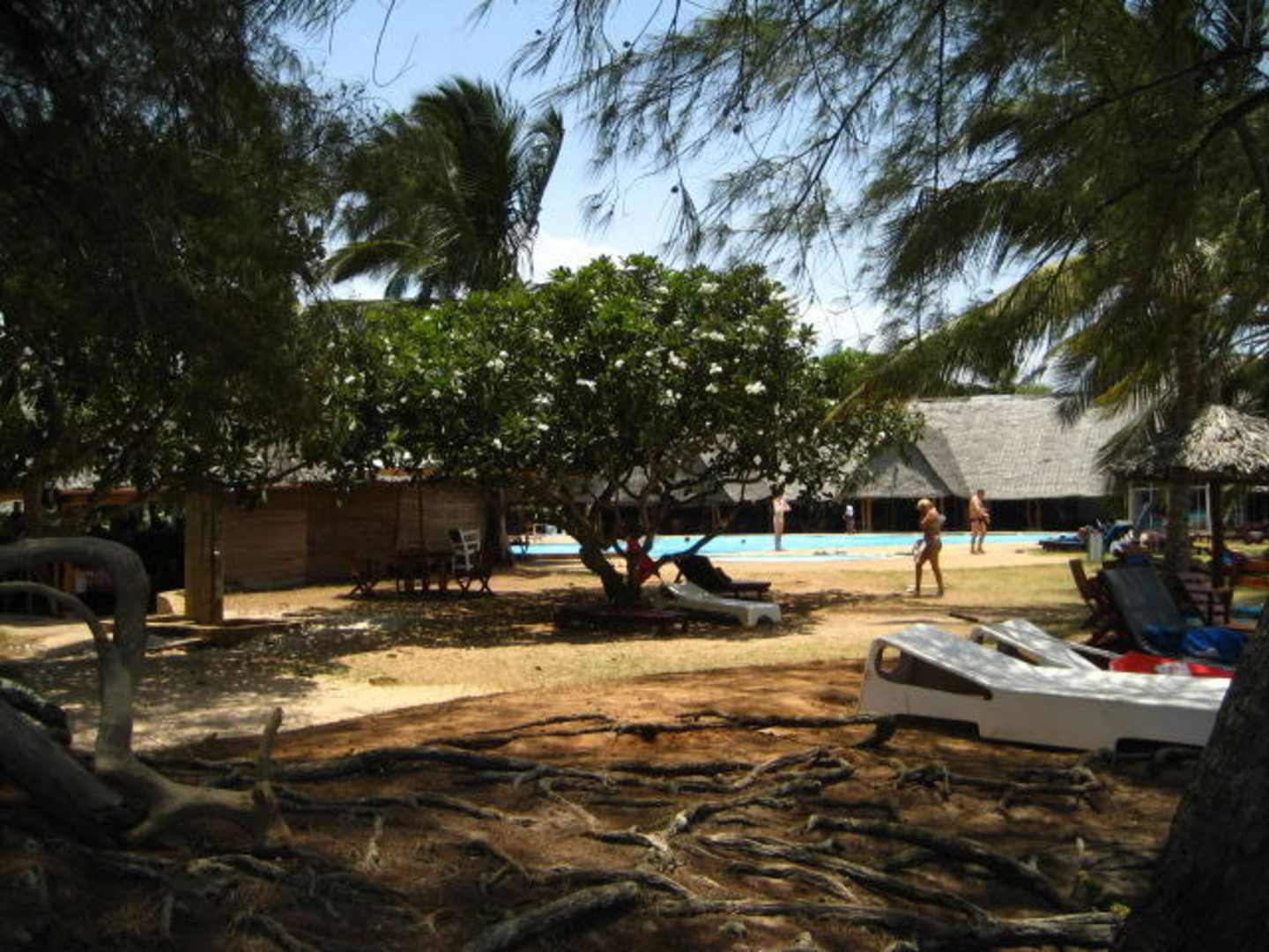 Im Vordergrund freiliegende Wurzeln, links die Dusche mit einem Teil der Poolbar mit Grill, hinter dem Pool das große Makuti-Dach des überdachten Open-Air Mittags- und Abendrestaurants