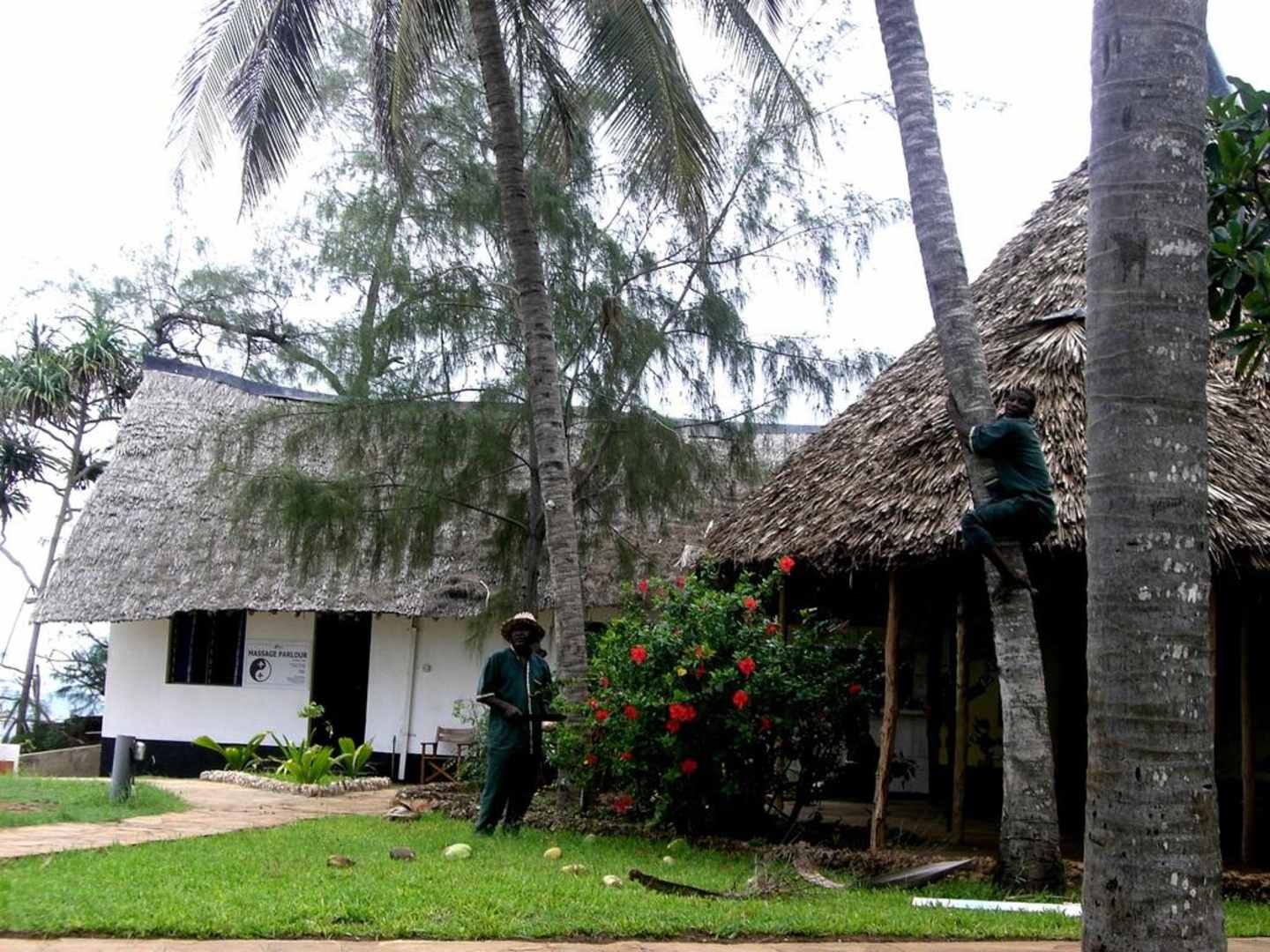 Blick von der Liege in Richtung Massage Haus. Rechts ist der Kinder Club.