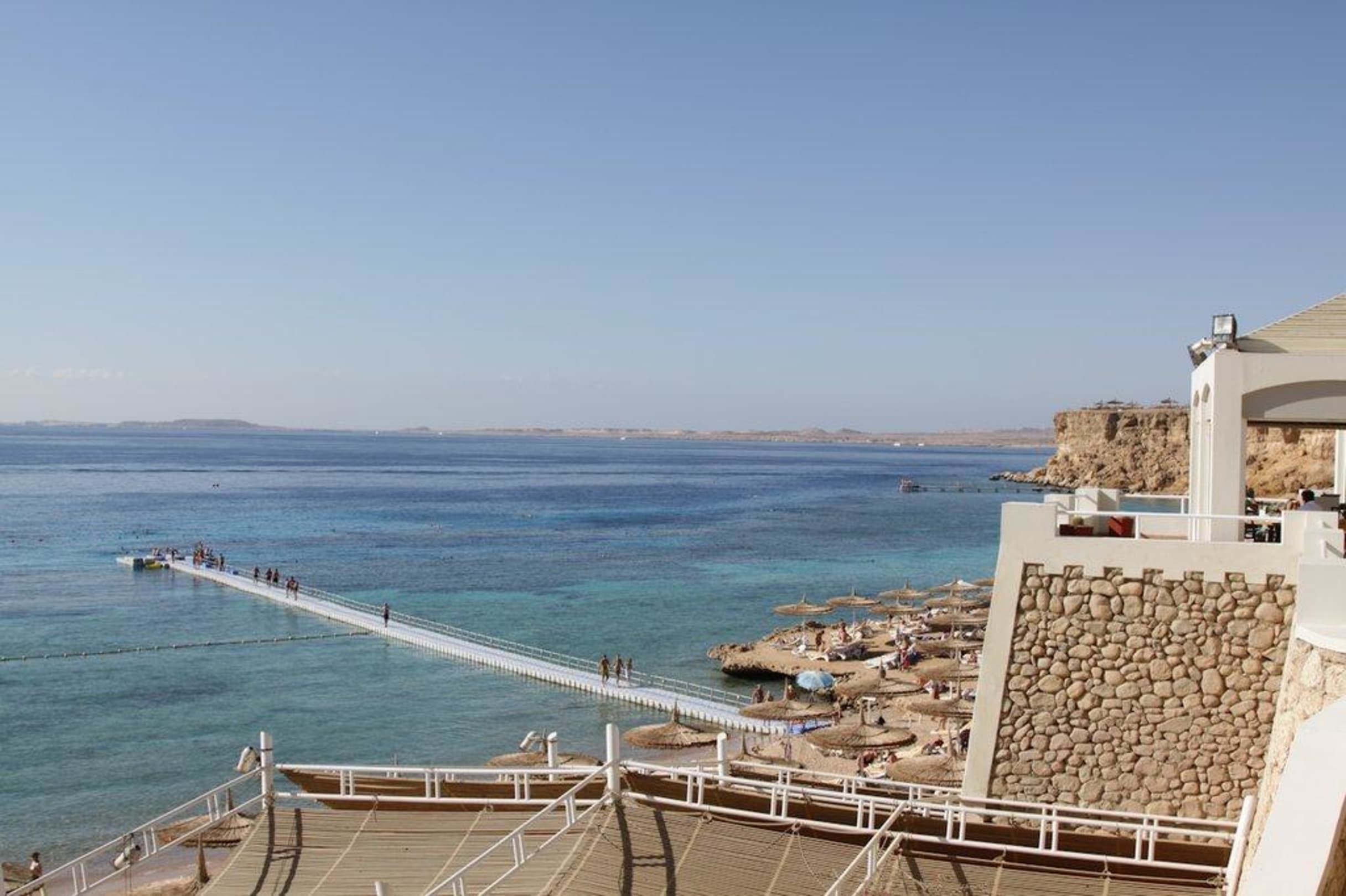 Blick auf den Strand mit Steg zum Riff