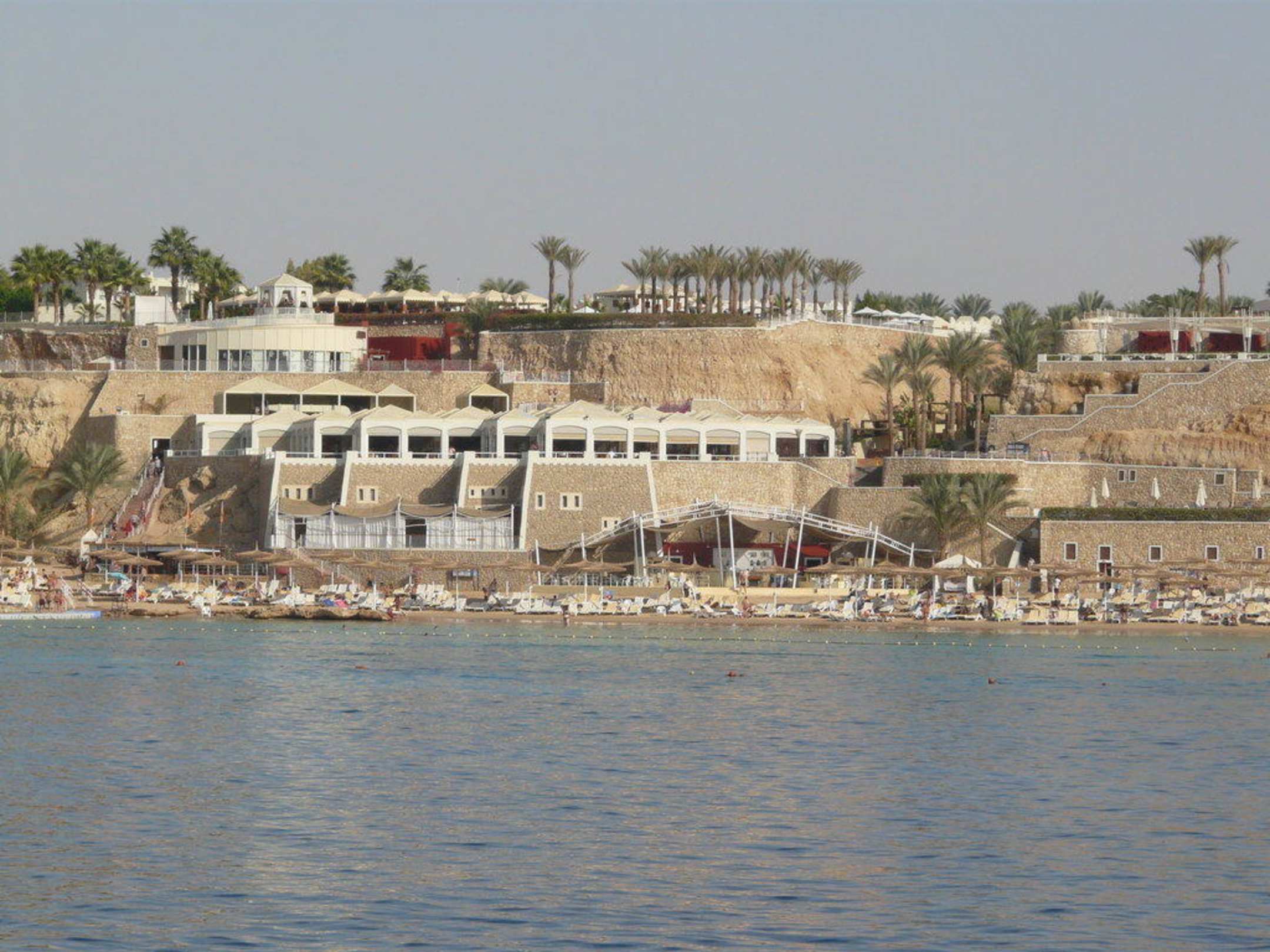 Blick vom Boot auf den Hotelstrand und das Grillrestaurant