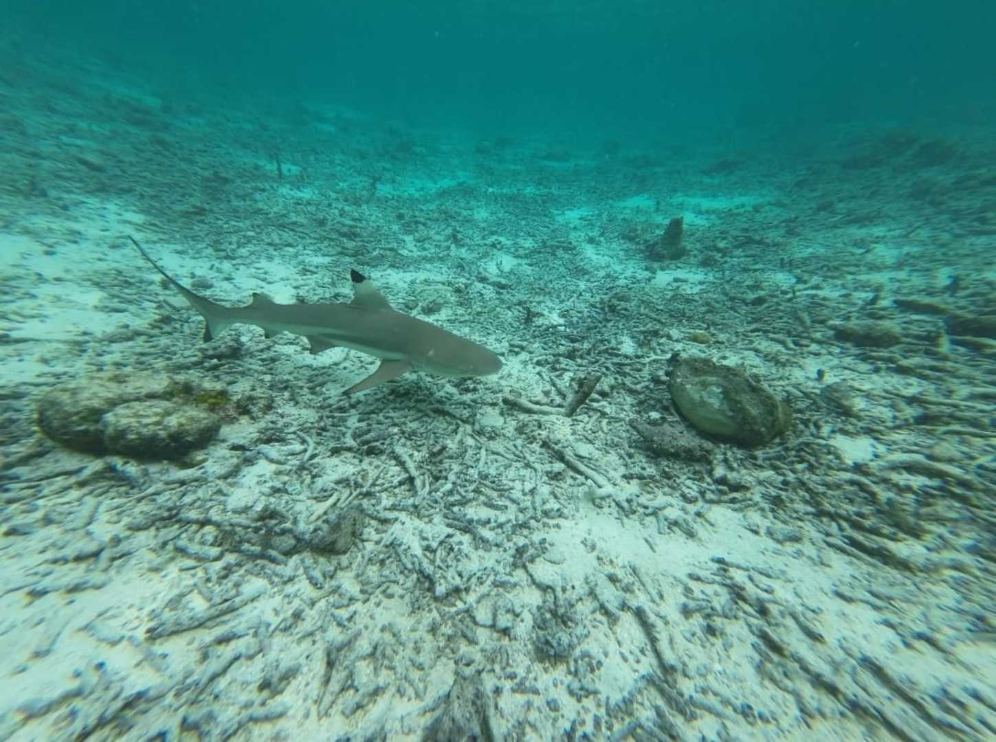 StrandHai direkt vor den Wasservillen gesehen. Hier gibt es kaum lebendige Korallen. Nur wenn man weiter raus, bzw. hinter den Villen schnorchelt.