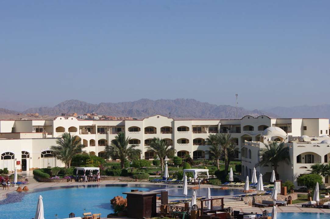 Widok na baseny, recepcję i góry