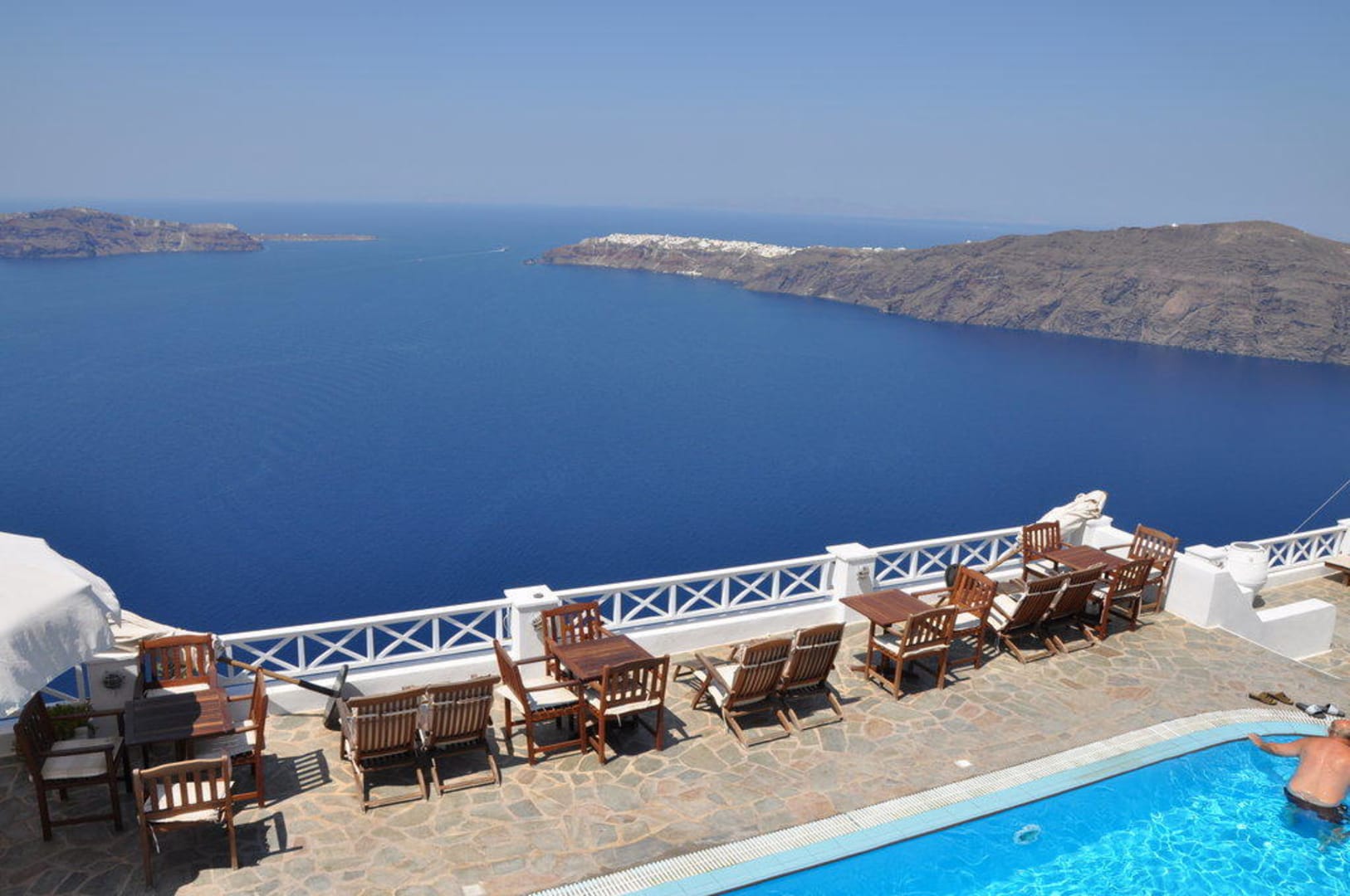 Blick über Pool und Terrasse aufs Meer