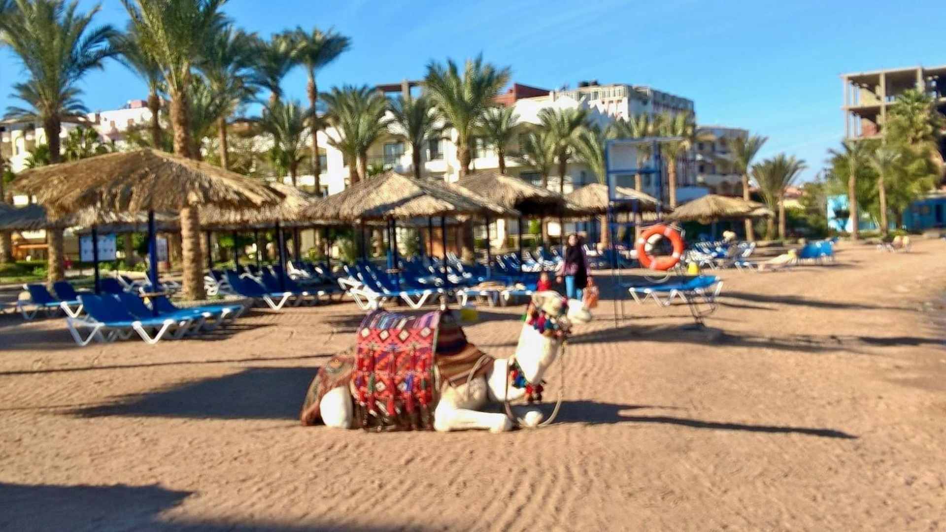 Morgens frisch geharkter Strand mit dem Hotel-Kamel