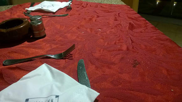 An dem dreckigen Tisch wurde Abend für uns Besteck und Serviette hingelegt