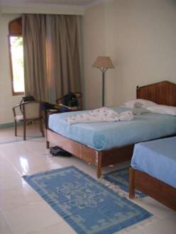 Das Bungalow-Innere: Sauber, geräumig (kommt auf dem Bild nicht ganz so rüber), mit Kühlschrank (lässt sich prima mit Getränken aus dem Supermarkt füllen (;-), einem Doppel- und einem Einzelbett.