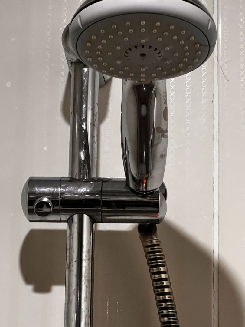 ZimmerModerne Duschbrause mit defektem Schlauch, aber was macht schon ein Knick im halb abgerissenen Brauseschlauch...