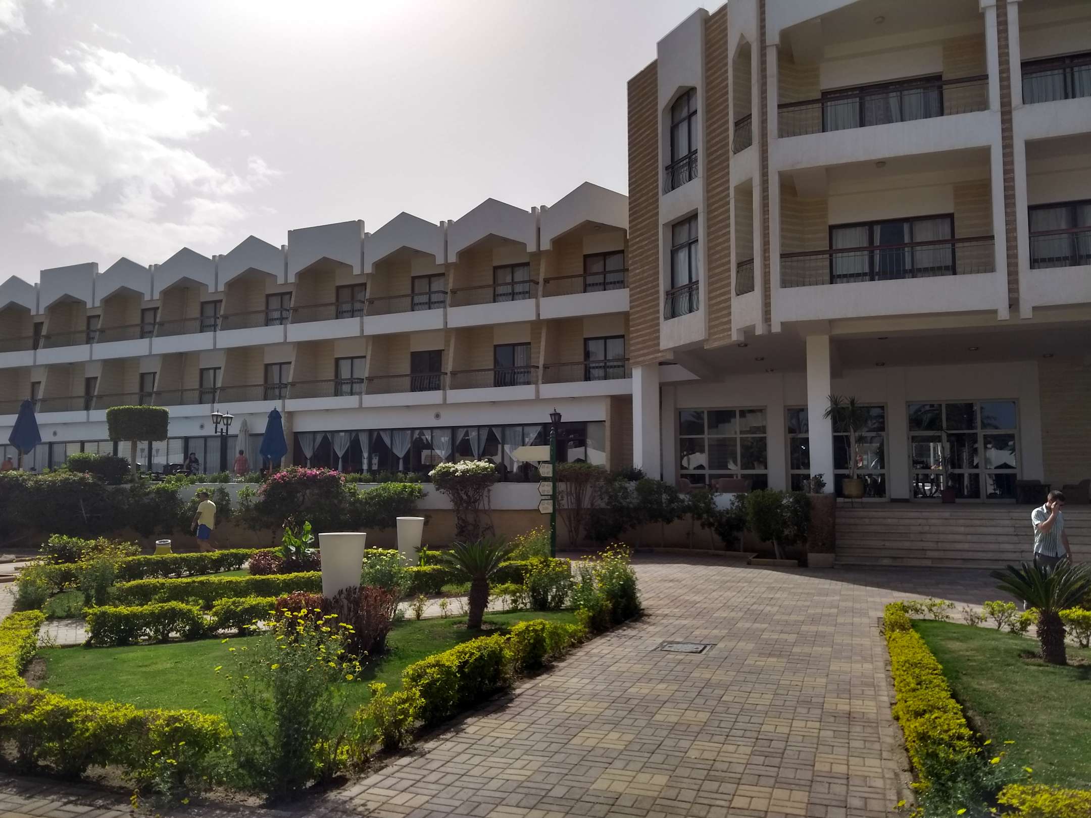 Rechte Seite vom Haupthaus mit Pool, Restaurant, Bar und Lob