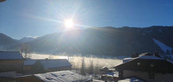 Morgentlicher Ausblick vom Balkon auf den Weissensee und die Skipiste.
