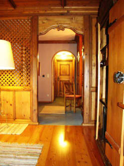 Blick vom Wohnraum durch das Schlafzimmer zur Eingangstür.